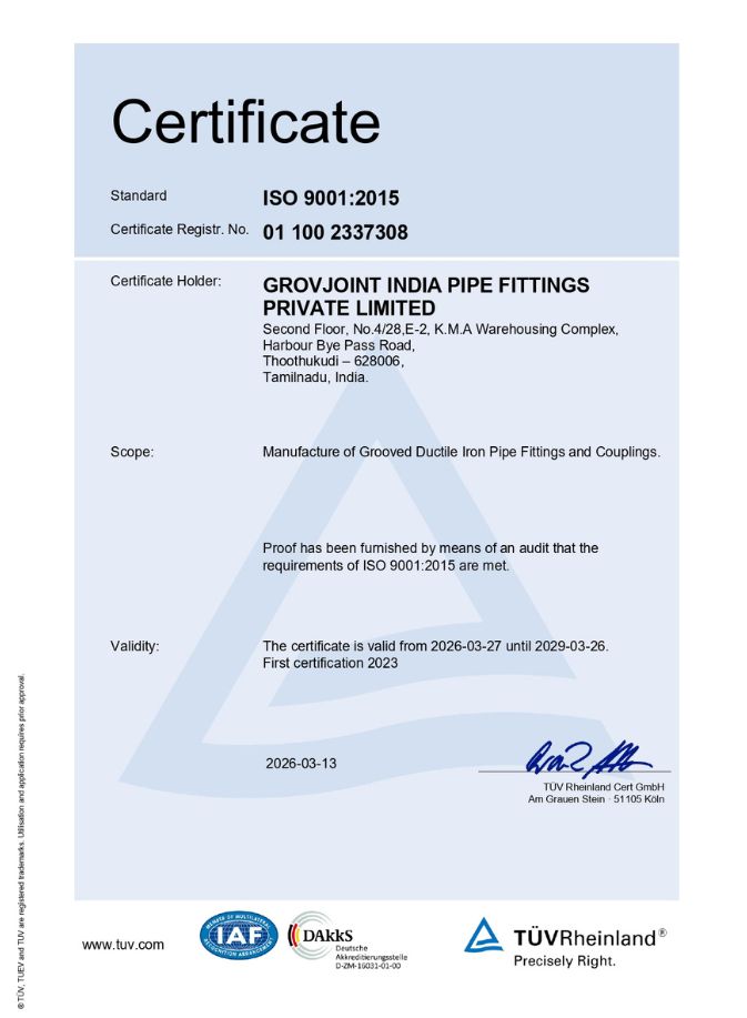 GROVJOINT INDIA PIPE FITTINGS was set up upon a dream, quality, and vision to provide infrastructure, fire protection, and building services industries with a remarkable range of premium products of grooved pipe fittings. Its mission is to serve the customer requirements in a superior manner by adopting a unique quantitative way with the help of advanced technology. The organization’s vision is to be one of the leading manufacturers and providers of Ductile Iron Pipe Fittings in the Asian Sub Continent.